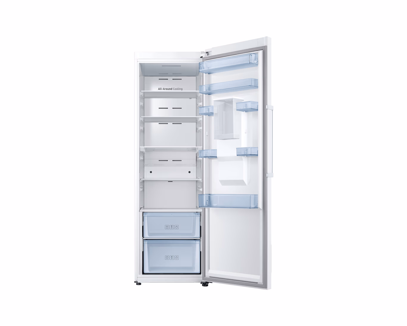 ثلاجة Samsung RR39M7310WW-SG ذات باب واحد بسعة 375 لتر باللون أبيض أنيق، مزوّدة بتقنية All-Around Cooling لتبريد متوازن في جميع أركان الثلاجة، موزّع مياه داخلي، Power Cool & Power Freeze لتبريد وتجمد سريع عند الحاجة، وضاغط Digital Inverter موفّر للطاقة وأهدأ في التشغيل. تصميم داخلي منظم مع 6 رفوف و7 جيوب باب لتخزين مرن ومريح. مثالية للاستخدام المنزلي الكلاسيكي بأداء قوي واقتصادي.