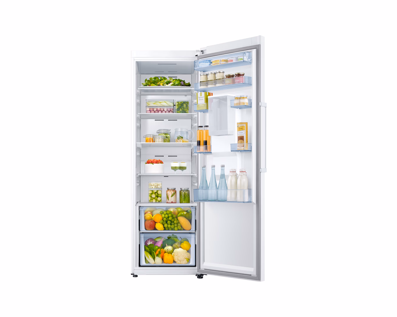 تتميز الثلاجة بتصميم أنيق بمقبض مخفي، وداخلية ذكية تشمل رفوف زجاجية مانعة للانسكاب، درجين للخضار والفواكه مع تحكم بالرطوبة، وقسم مخصص لمنتجات الألبان للحفاظ على النضارة لأطول فترة ممكنة. متوفرة باللون الأبيض أو الفولاذ البرو لتناسب مختلف أنماط المطابخ.