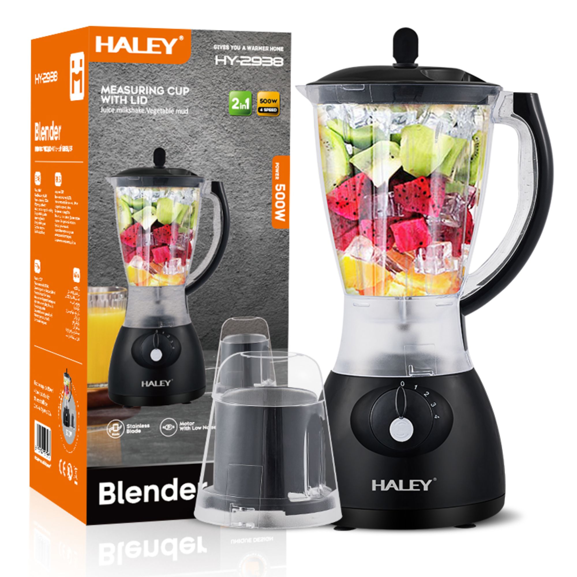 خلاط كهربائي HALEY 1.5 لتر – 500 واط – مع مطحنة – 4 سرعات – مثالي للعصائر والسموثي