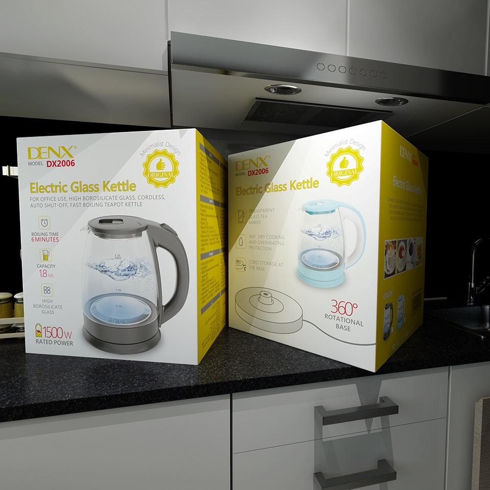 غلاية الماء DENX DX2006 تمنحك غلي الماء بسرعة وأمان — سعتها الكبيرة 1.8 لتر، قوة تسخين 1500 واط، وتصميم زجاجي أنيق يضيف لمسة عصرية لمطبخك. فقط اضغط زر التشغيل وانتظر بضع دقائق لتحضير الشاي أو القهوة أو الماء الساخن بسهولة.