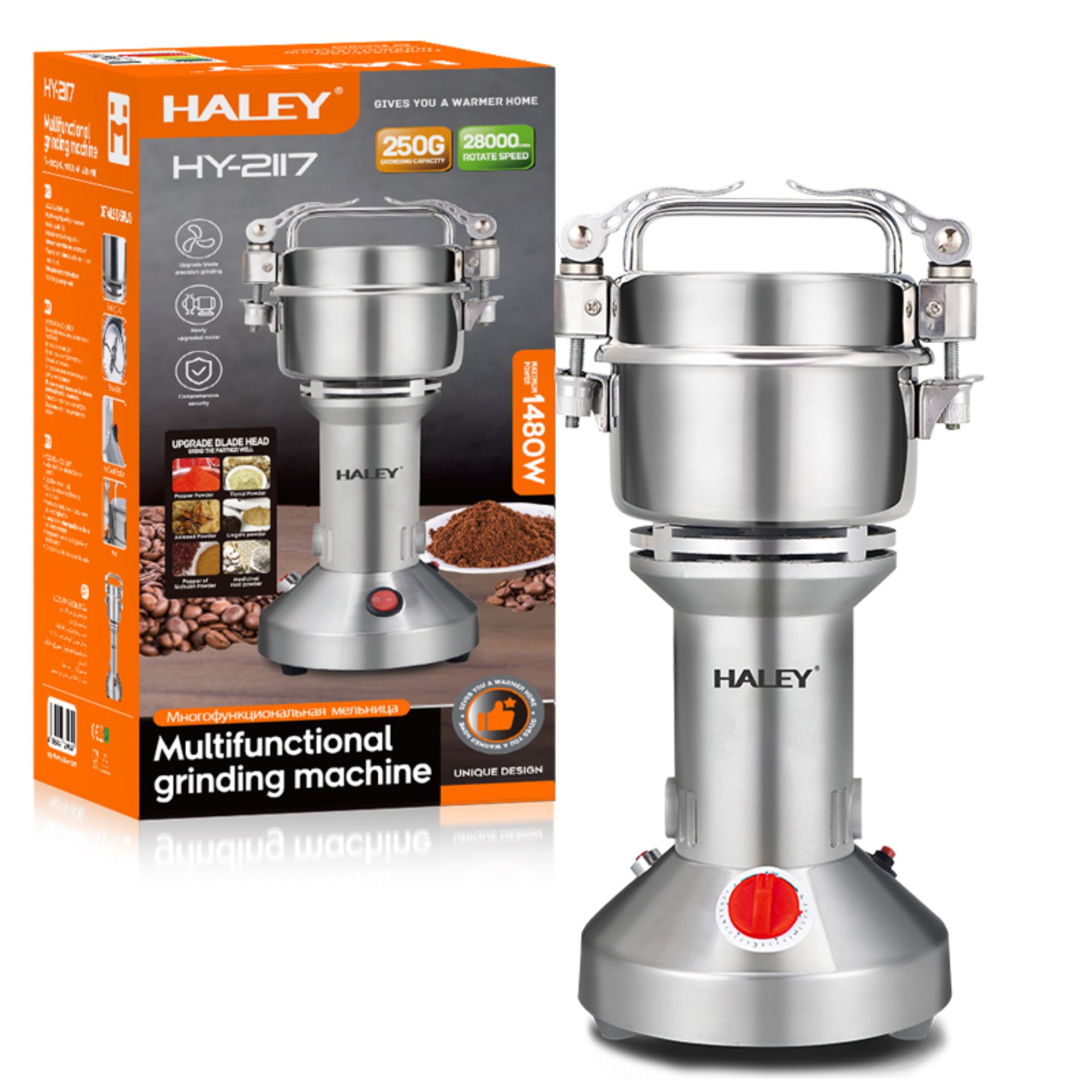 مطحنة HALEY HY-2117 تقدم أداء عالي بقدرة 1480 واط مع سعة كبيرة 250 غرام، مما يجعلها مناسبة للاستخدام المكثف.