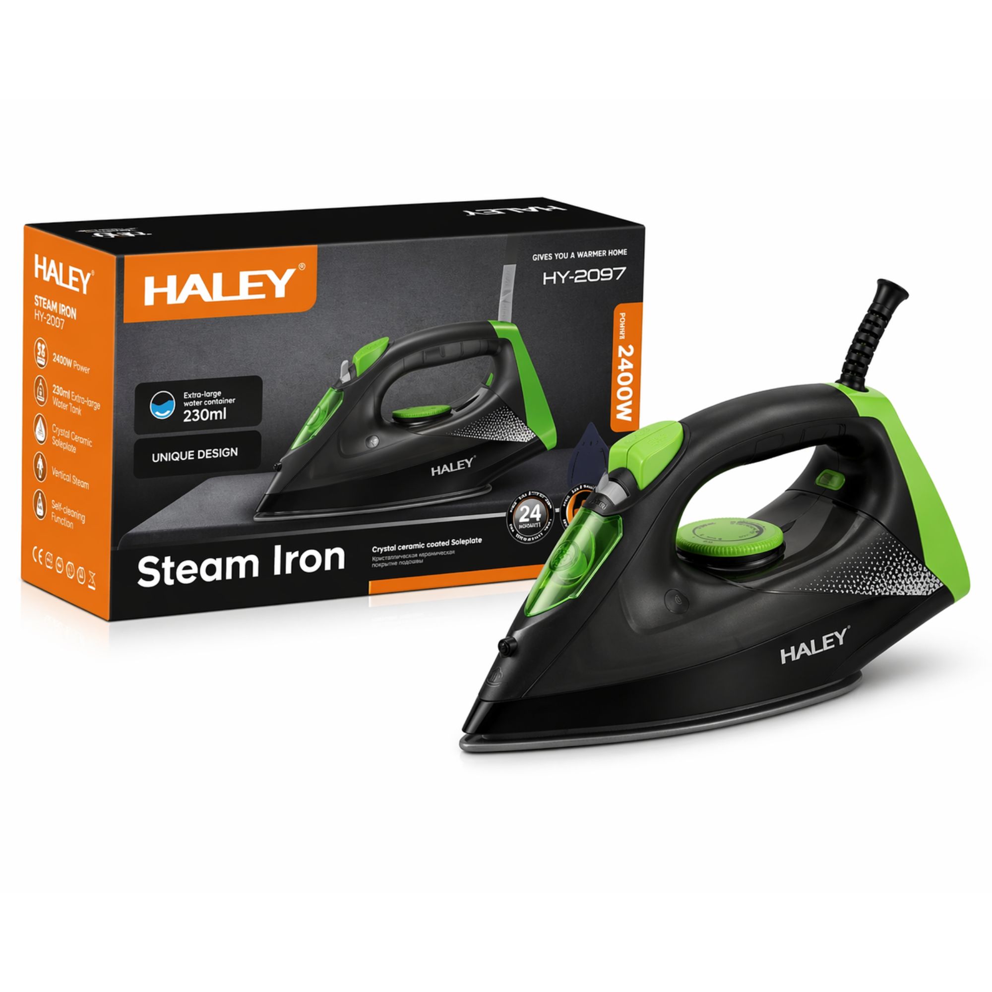 مكواة HALEY HY-2097 توفر أداء عملي بقدرة 2400 واط مع تسخين سريع ونتائج كي فعالة.