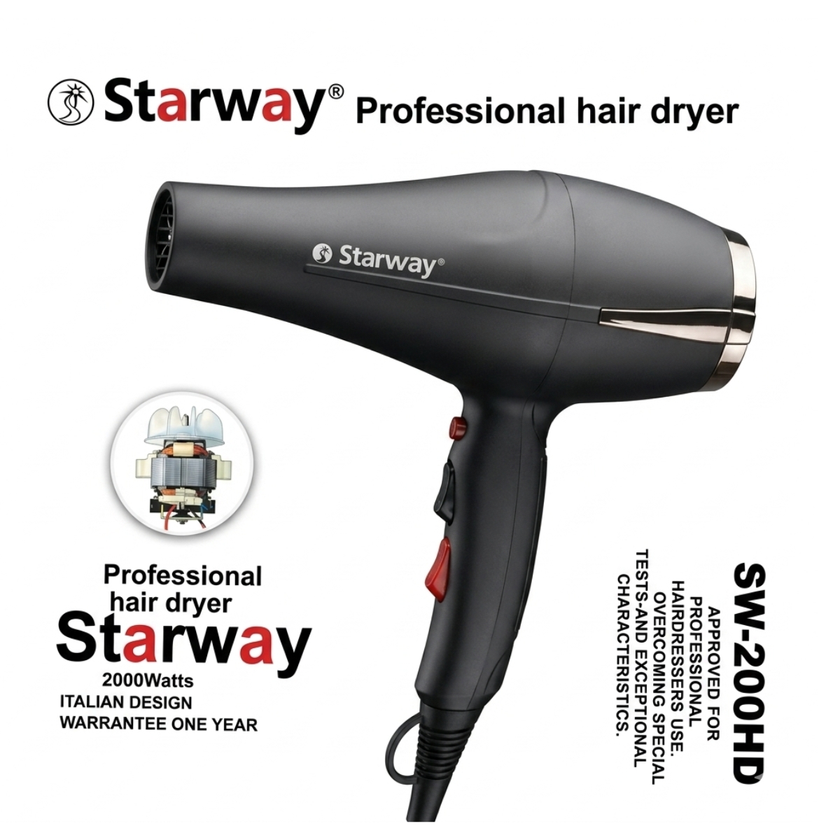 SW-200HD سيشوار ستارواي 2000 واط – ديفيوزر – تحكم بالحرارة – فلتر قابل للفك – تصميم إيطالي